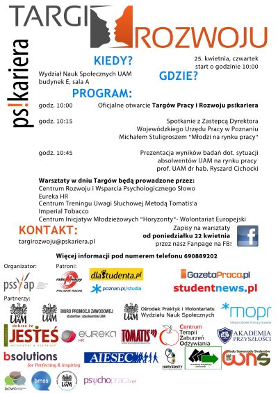 25 kwietnia 2013 roku na Wydziale Nauk Społecznych Uniwersytetu im. Adama Mickiewicza w Poznaniu odbędą się II Wielkopolskie Targi Pracy i Rozwoju ps!kariera.