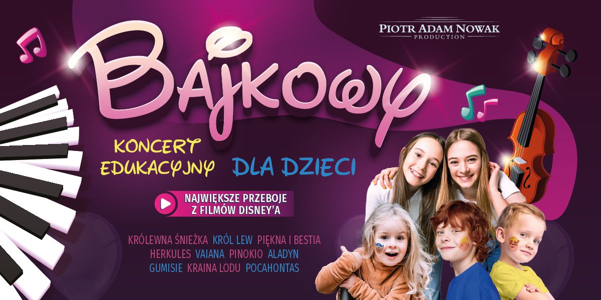Wyjątkowy koncert muzyczno-edukacyjny dedykowany dzieciom w wieku przedszkolnym, będących fanami najpopularniejszych bajek animowanych. Muzycy zabiorą najmłodszych w muzyczną podróż po świecie bajek Walta Disneya, takich jak Vaiana, Kraina Lodu, Herkules, Pocahontas, Piękna i Bestia, Król Lew, Królewna Śnieżka, a także do krainy Smerfów i Gumisiów. Maluchy usłyszą swoje ulubione piosenki w zachwycających aranżacjach na głosy wokalne i kwartet smyczkowy.
